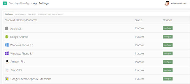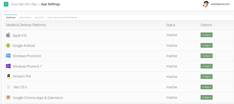 Để kích hoạt, bạn vào phần App Settings trong trang chủ OneSignal và ấn nút Configure của từng nền tảng bạn muốn kích hoạt.
