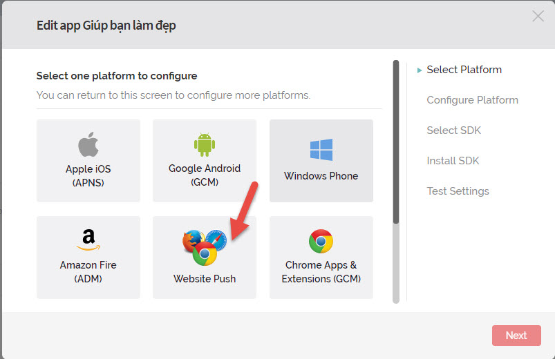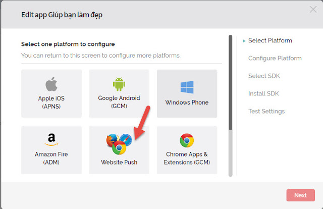 Sau khi tạo xong, các bạn chọn Website Push ở phần chọn nền tảng.