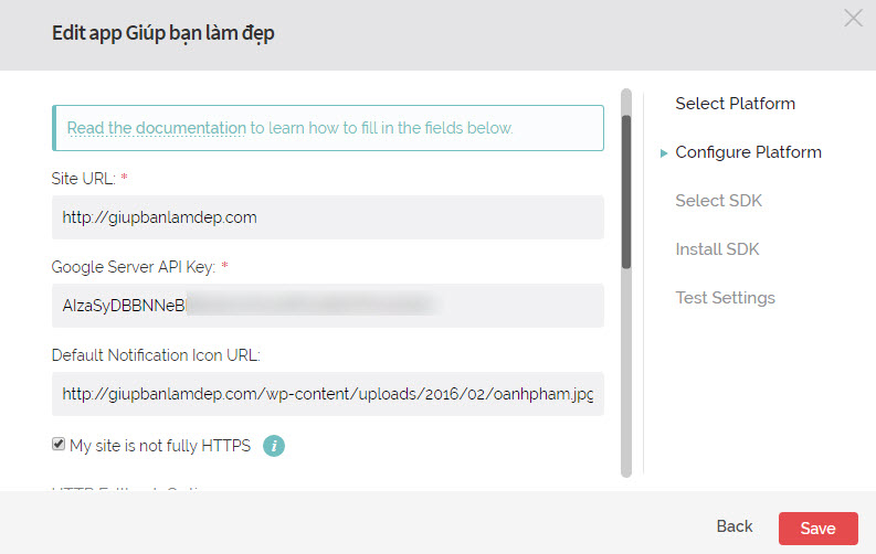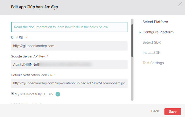 Tiếp tục tới bước này, bạn hãy vào website WordPress của bạn và cài plugin OneSignal – Free Web Push Notifications để nhúng nó vào website. Khi cài đặt, bạn hãy điền Rest API Key và App ID của OneSignal cùng với Google Project ID (Sender ID) vào.