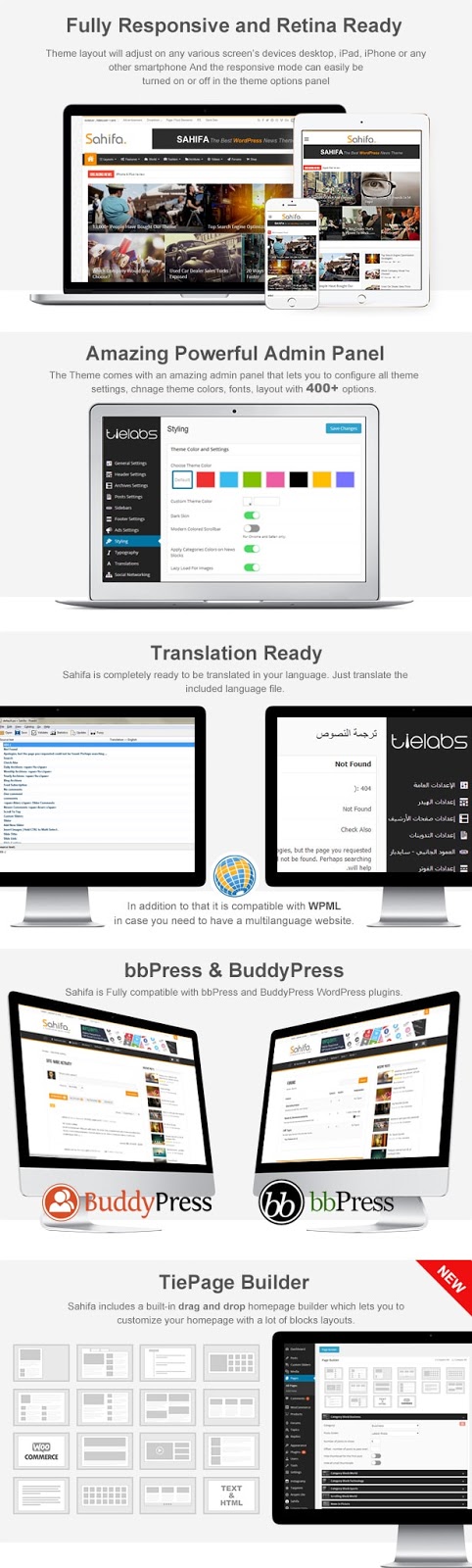 Sahifa là một trong những chủ đề trang web linh hoạt nhất trên thế giới. sản phẩm tuyệt vời này cung cấp nhiều tính năng đáng kinh ngạc, mỗi thêm vào để tăng cường trang web của bạn. Nó quản lý để cân bằng sức mạnh và vẻ đẹp, kết quả là một kinh nghiệm duyệt web chất lượng cao cho tất cả người dùng. Nhiều trang web phải lựa chọn giữa sự phức tạp và khả năng tiếp cận, cho rằng cách bố trí của họ không thể thích ứng với các màn hình nhỏ bé của các thiết bị cầm tay. Rất may, chủ đề này đã giải quyết tất cả các khả năng tương thích và các vấn đề thay đổi kích thước. Những khách hàng thích điện thoại thông minh hay máy tính bảng hiện nay có thể truy cập vào bài viết của mình một cách dễ dàng. Ngoài ra, Sahifa có thể làm việc với bất kỳ hệ điều hành hoặc trình duyệt. Khách hàng được cung cấp hoàn toàn tự do, và họ thậm chí có thể tắt các yếu tố đáp ứng các trang của họ.